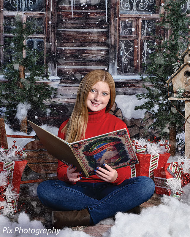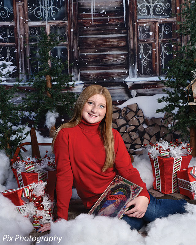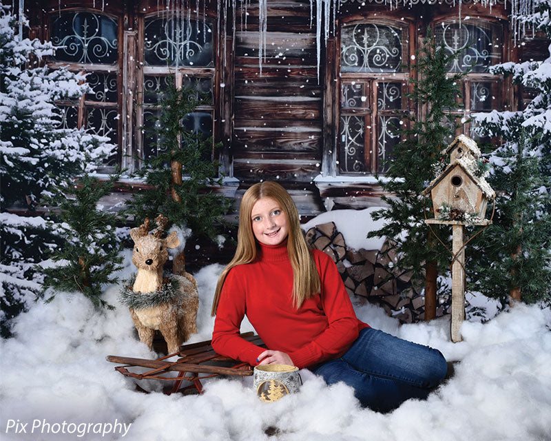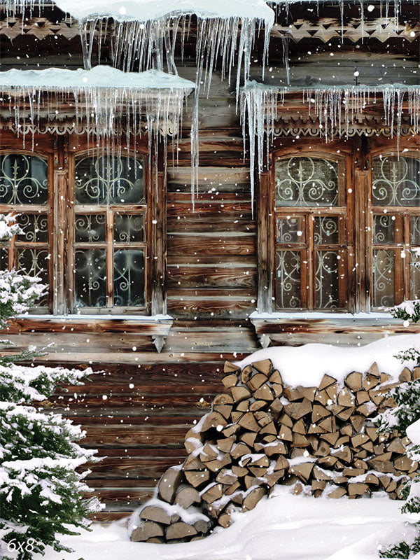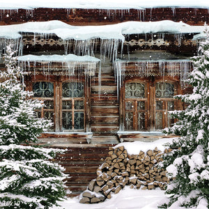The Rustic Winter Cabin Photography Backdrop captures the serene beauty of a snow-covered cabin scene. Featuring an aged wooden cabin with frosted windows and icicles hanging from the roof, this backdrop provides a cozy, wintery atmosphere. Piles of firewood stacked against the cabin and a dusting of snow complete the scene, creating a perfect setting for winter-themed photoshoots.
