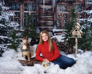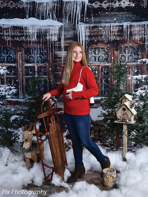 This backdrop immerses you in the heart of a tranquil winter wonderland. The rustic cabin, crafted from weathered wood, stands as a testament to the simple, serene beauty of a snow-covered landscape. Intricately detailed windows, adorned with frosty designs, peek out from the cabin, offering a glimpse of warmth inside. Icicles hang delicately from the roof, adding a natural touch to the winter scene.