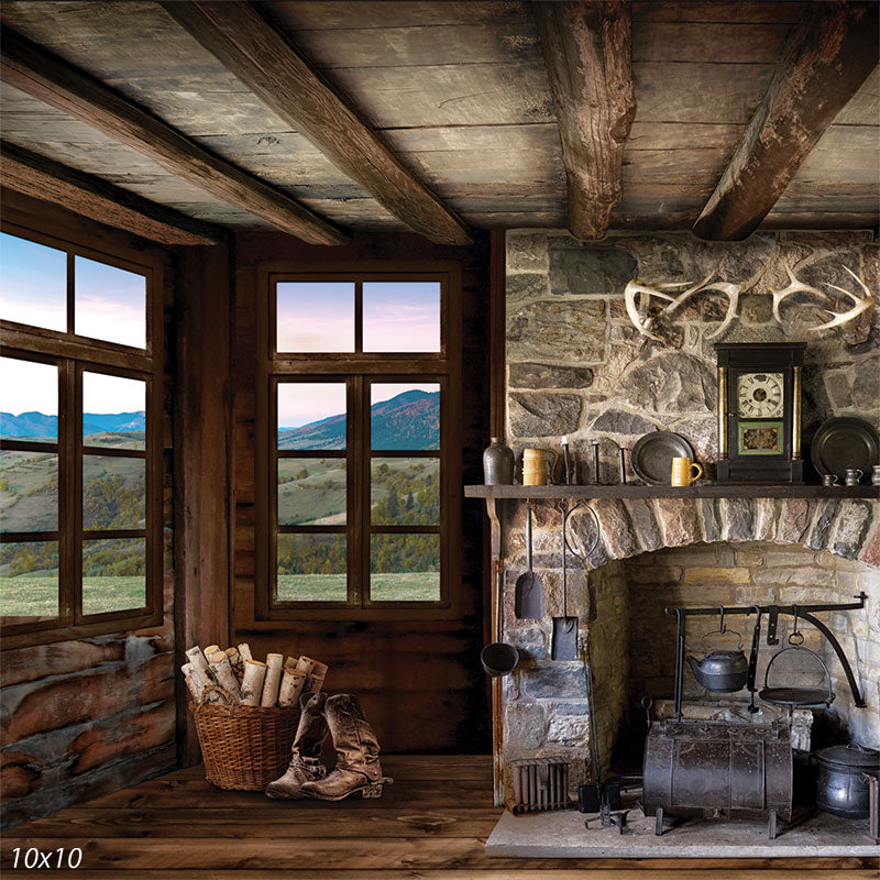 Step into the warmth and charm of a rustic cabin with the Rustic Cabin Fireplace Photography Backdrop. This beautifully detailed backdrop features a stone fireplace, wooden beams, and a window overlooking a stunning mountain landscape. Perfect for creating a cozy, homely feel in your photography, this backdrop is ideal for winter and holiday-themed photoshoots.