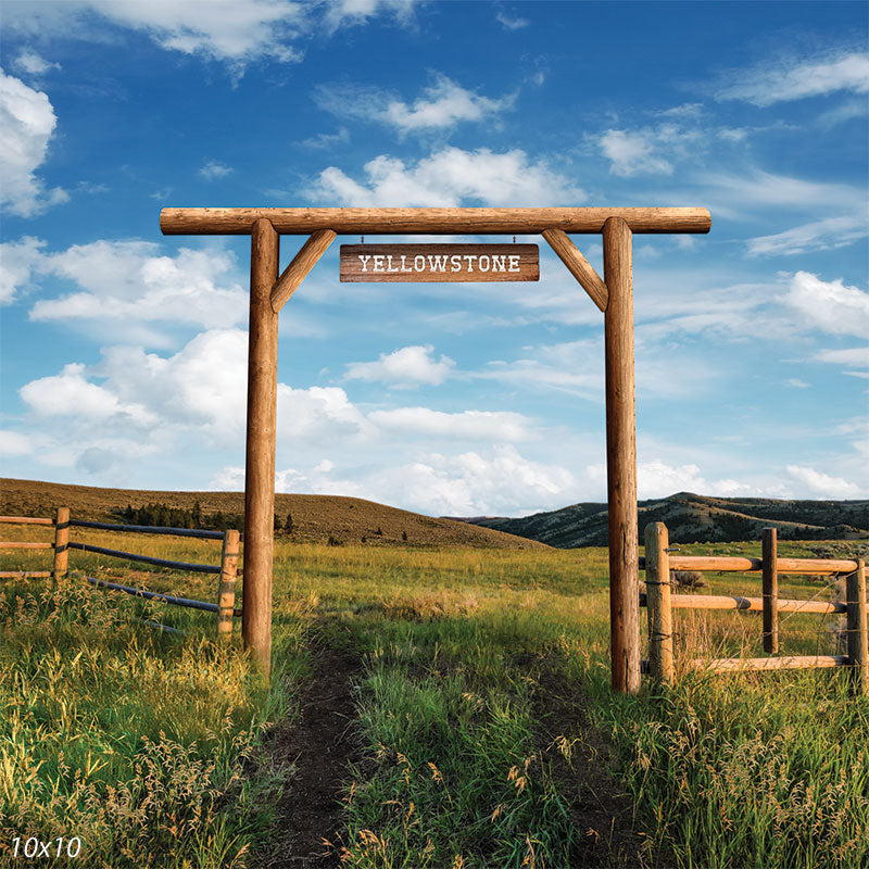 Step into the western wilderness with the Yellowstone Ranch Photography Backdrop. Featuring a rustic ranch gate with a "Yellowstone" sign, this backdrop creates a stunning scene of wide-open plains, grassy fields, and a brilliant blue sky. It's perfect for outdoor-themed or western-style photography sessions.