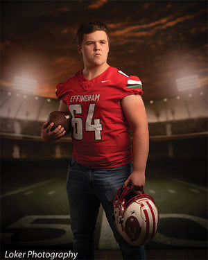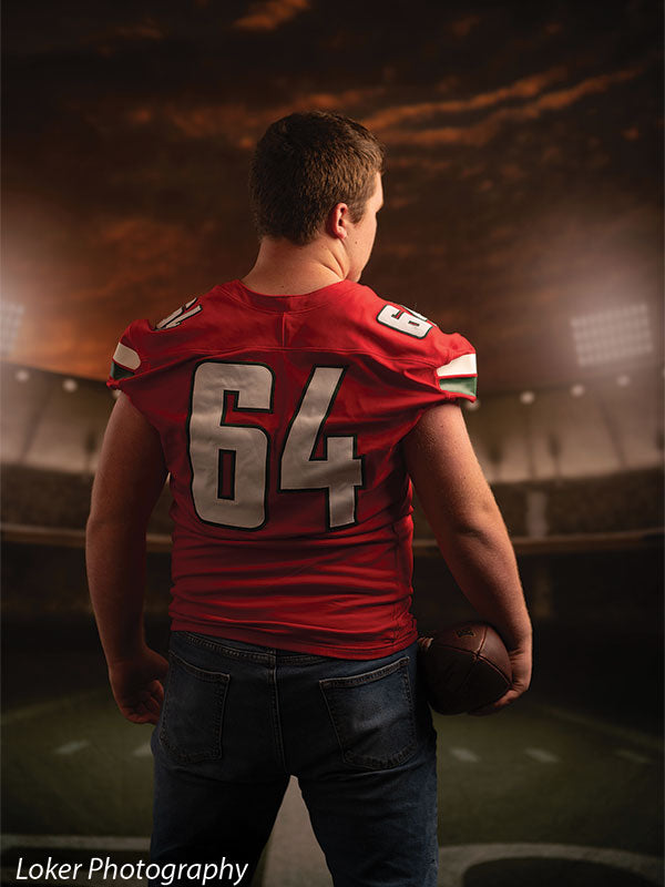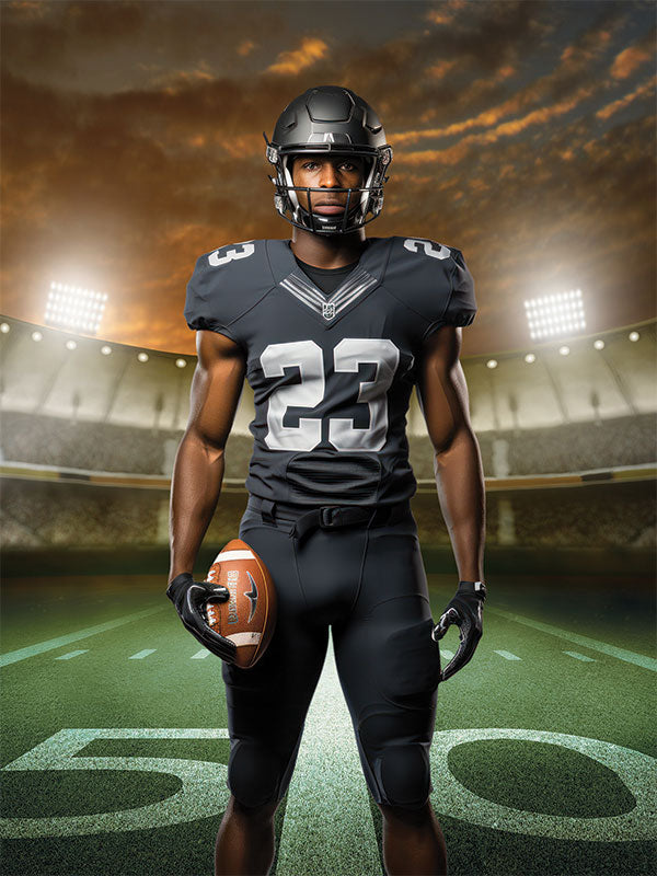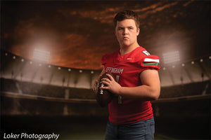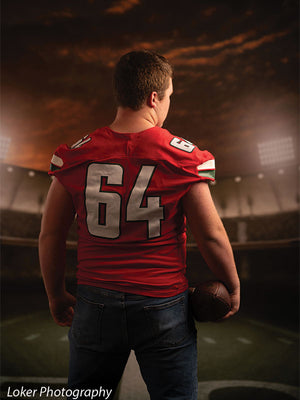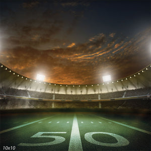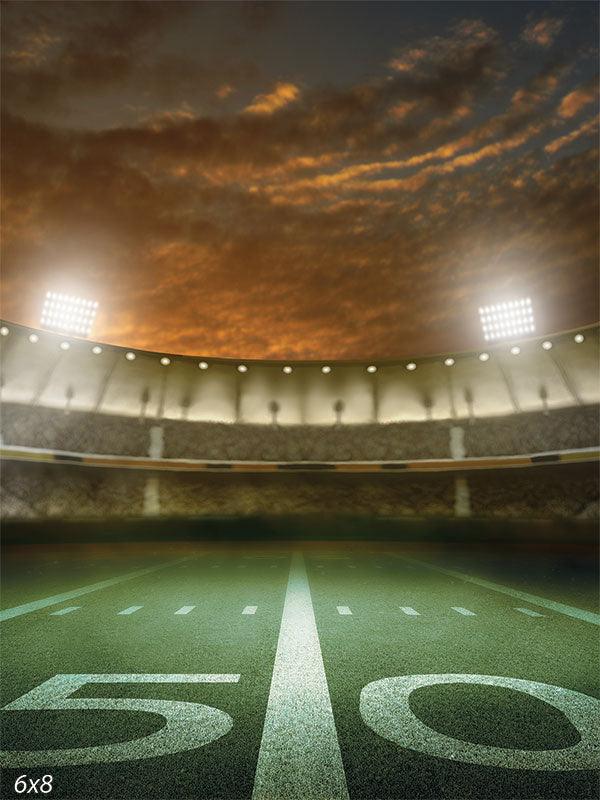 Capture the thrill of the game with the Stadium 50-Yard Line Photography Backdrop. This backdrop features a dynamic view of a football stadium from the 50-yard line, set against the dramatic backdrop of a setting sun and stadium lights. Perfect for sports-themed photoshoots, senior pictures, and action shots, this backdrop brings the excitement of the big game right into your studio.
