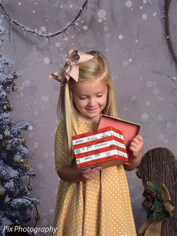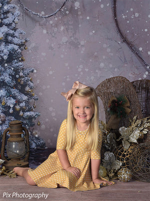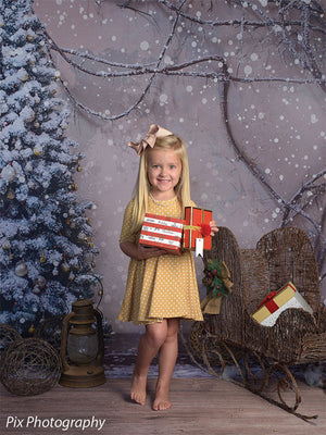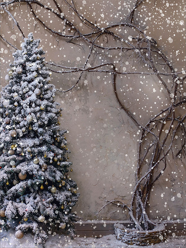 Step into a magical winter wonderland with the Snowy Tree and Branch Photography Backdrop. This beautifully crafted scene features a festive, snow-covered Christmas tree adorned with golden ornaments and elegant bare branches wrapped in frost, set against a softly textured background. This backdrop brings the spirit of the holiday season to life, making it perfect for winter-themed photoshoots, holiday portraits, and Christmas card sessions.