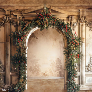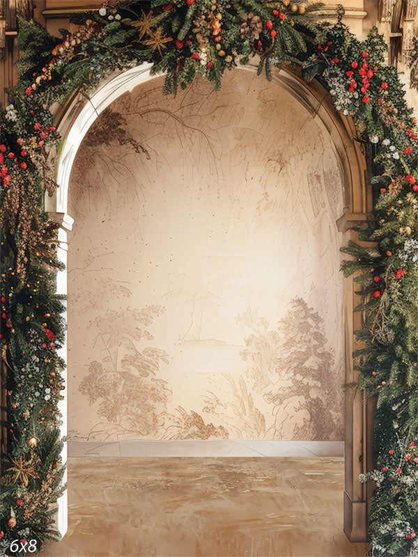 Transform your photography sessions with our Christmas Archway Photography Backdrop, an exquisite piece designed to create enchanting holiday memories. This backdrop features a beautifully adorned archway, complete with lush green garlands, red berries, and golden ornaments. The archway opens up to a soft, hand-painted mural of a serene winter landscape, providing a perfect blend of elegance and festivity.