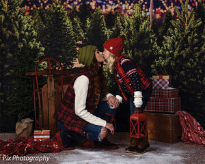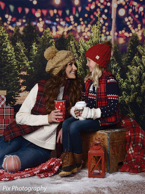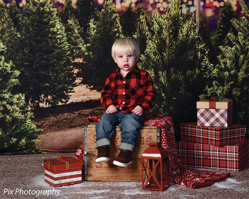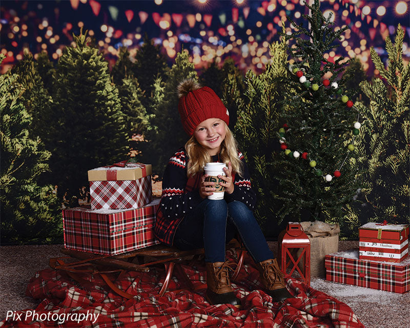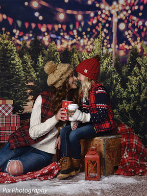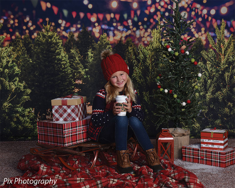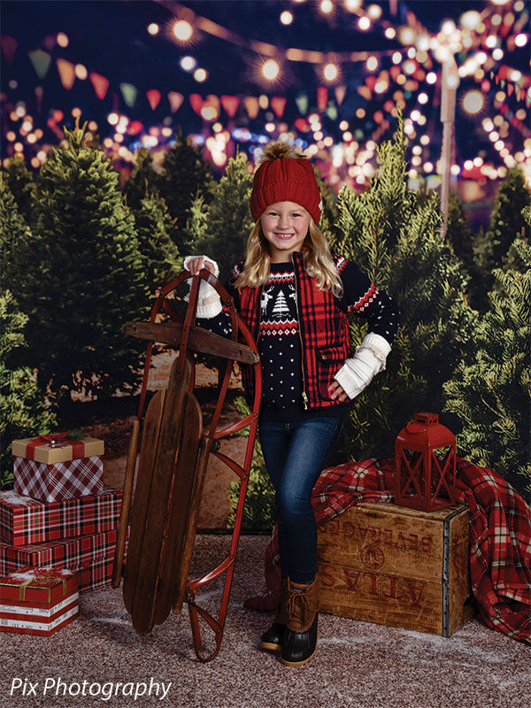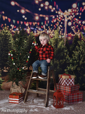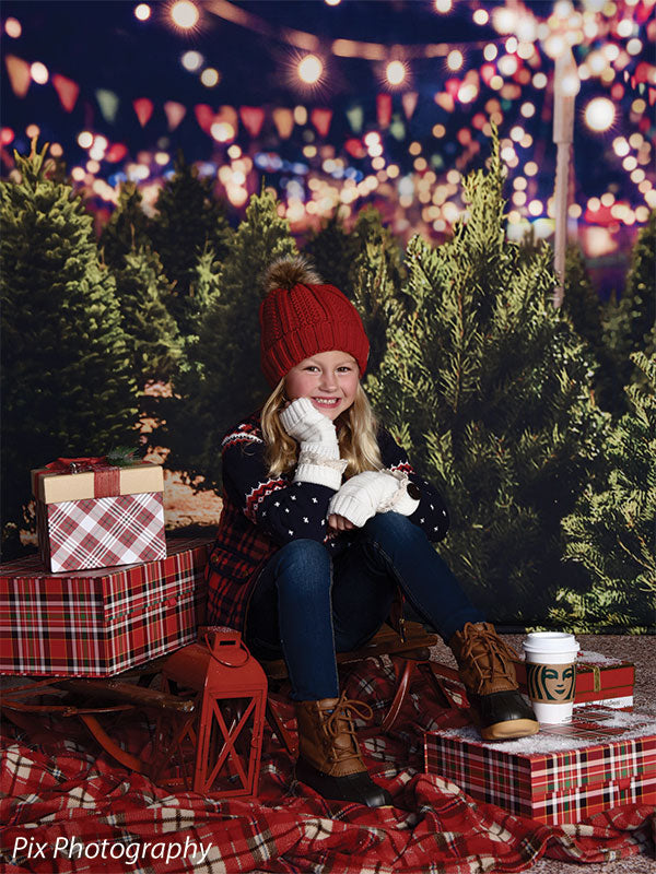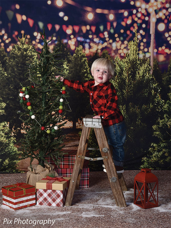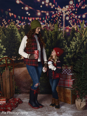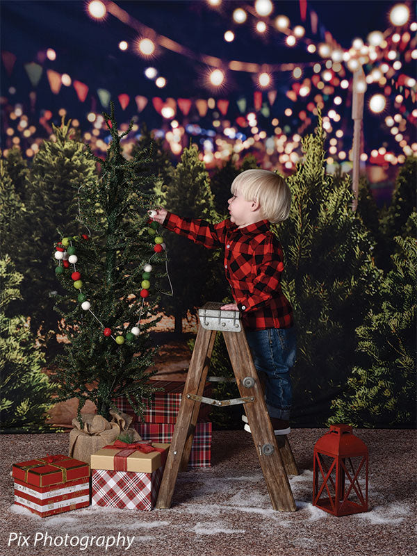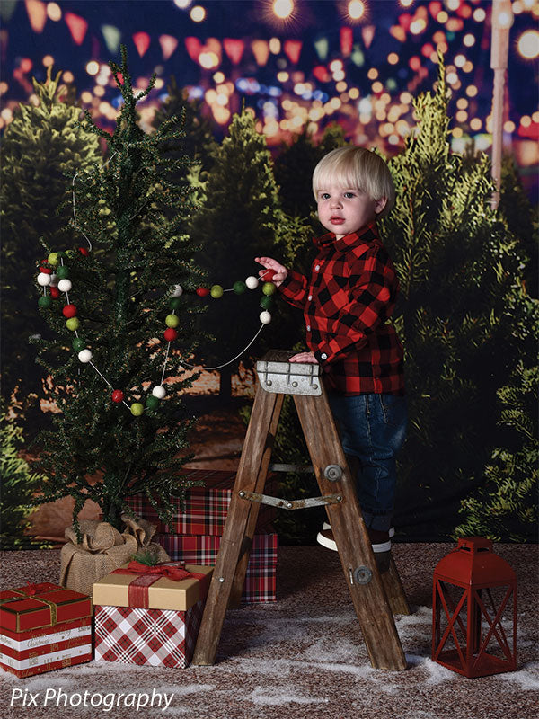 The Christmas Tree Lot Night Photography Backdrop brings the charm and warmth of a bustling holiday tree lot to your photography studio. Under a canopy of glowing holiday lights, rows of vibrant green Christmas trees create a magical setting, perfect for capturing the spirit of the season. The backdrop features rich colors, including deep greens from the trees and golden yellow hues from the festive lights overhead. This backdrop is designed to create an immersive holiday experience in every photo, whether you’re shooting family portraits, kids' holiday photos, or product photography for the festive season.