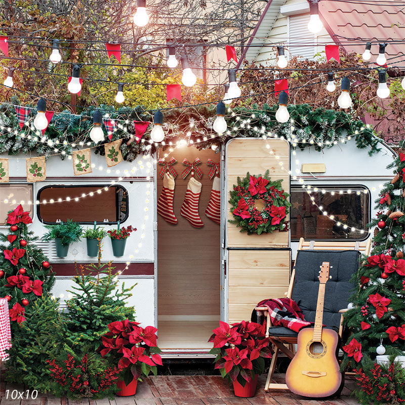 The Cozy Christmas Camper Photography Backdrop brings the festive spirit to your photoshoots, encapsulating the warmth and charm of a holiday camper scene. This backdrop features a beautifully decorated camper adorned with Christmas lights, garlands, stockings, and a festive wreath. Poinsettias and other holiday decorations enhance the scene, making it perfect for creating a cozy, joyful atmosphere. The details of the camper’s wooden door, hanging stockings, and twinkling lights add depth and character to the image, providing an inviting background for holiday portraits.