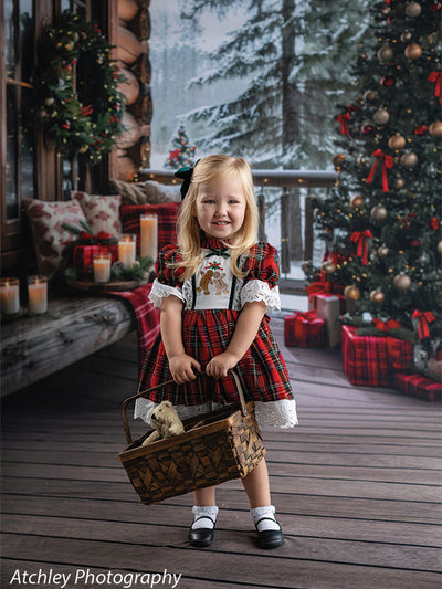 Immerse your studio in the warmth and charm of the holidays with the Cozy Log Cabin Christmas Tree Printed Photography Backdrop. This inviting scene features a rustic wooden porch adorned with glowing candles, plaid-wrapped gifts, evergreen wreaths, and a fully decorated Christmas tree set against a peaceful snow-covered forest. Ideal for capturing heartfelt holiday moments, this backdrop offers an atmosphere that feels both luxurious and homey.
