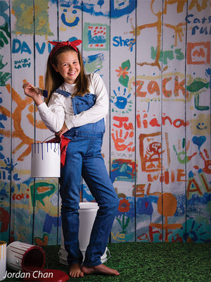 Infuse your photo sessions with creativity and fun using the Doodles Photography Backdrop. Featuring a lively collage of colorful, hand-drawn doodles, cheerful suns, names, and playful shapes on a faux wood panel design, this backdrop creates an energetic, youthful vibe. Its bright tones and whimsical artwork are perfect for adding personality and joy to portraits, kids’ photography, and lifestyle sessions.