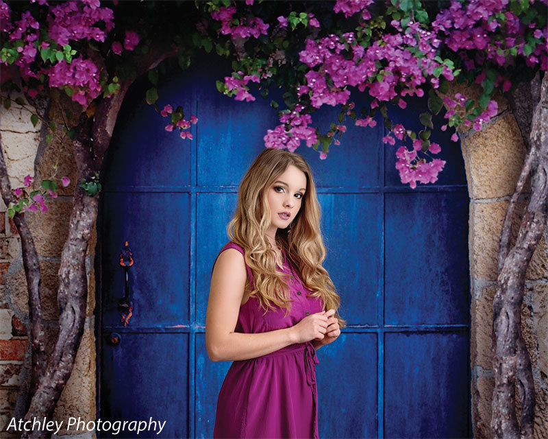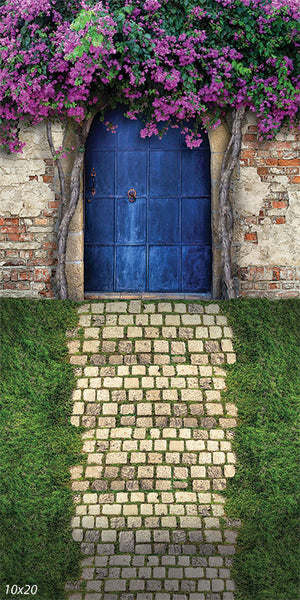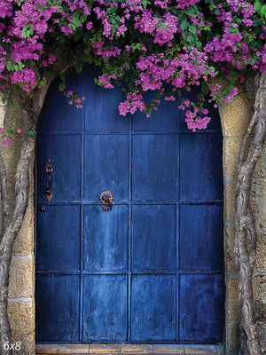 Bring the beauty of a quaint European garden to your photoshoots with the Floral Blue Door Photography Backdrop. Featuring a deep blue door framed by a rustic stone arch and adorned with vibrant purple bougainvillea flowers, this backdrop adds a touch of elegance and romance to any image.
