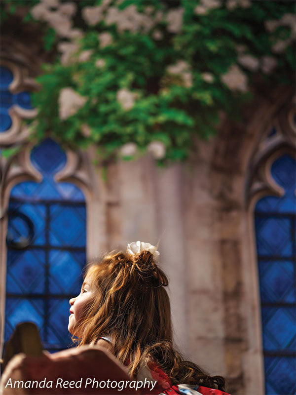 • Main Colors: Beige stone, green leaves, white flowers, and blue stained glass.
