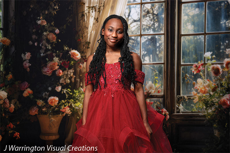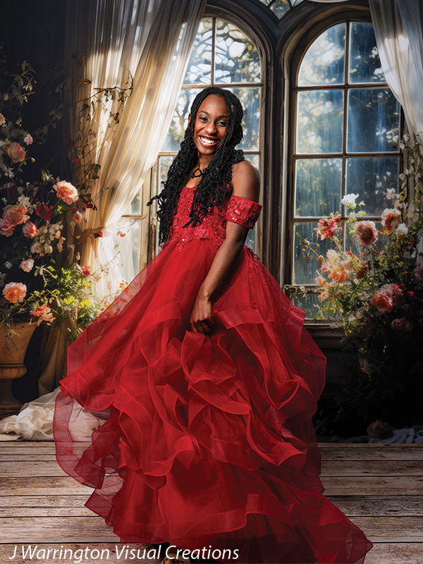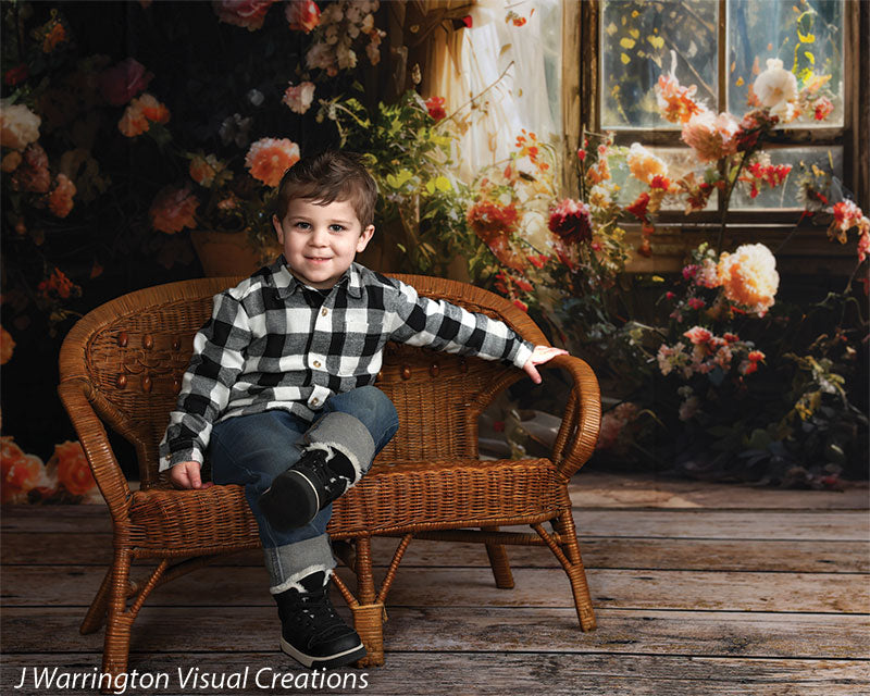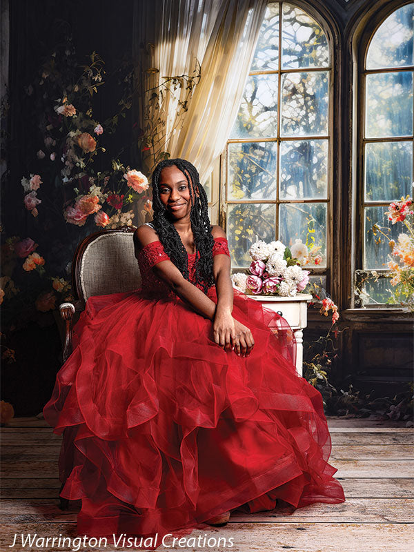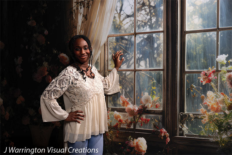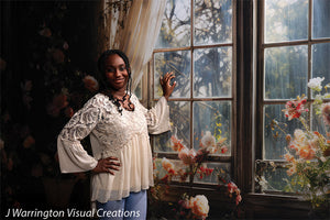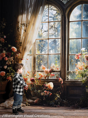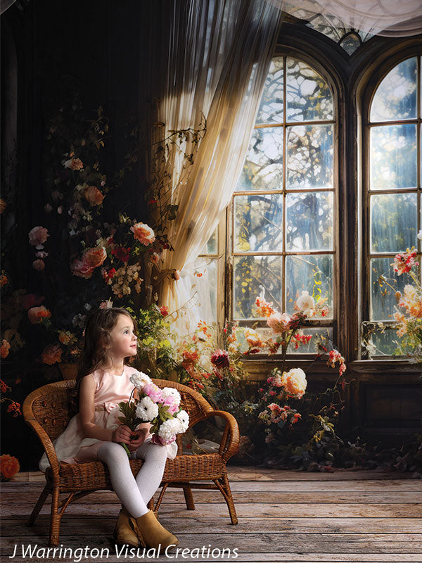 The Elegant Floral Window Photography Backdrop provides a serene and beautiful setting for your photoshoots. This backdrop features a vintage window with softly flowing curtains, surrounded by an array of delicate flowers. The natural light filtering through the window enhances the ethereal and timeless atmosphere, making it an ideal choice for various photography sessions.
