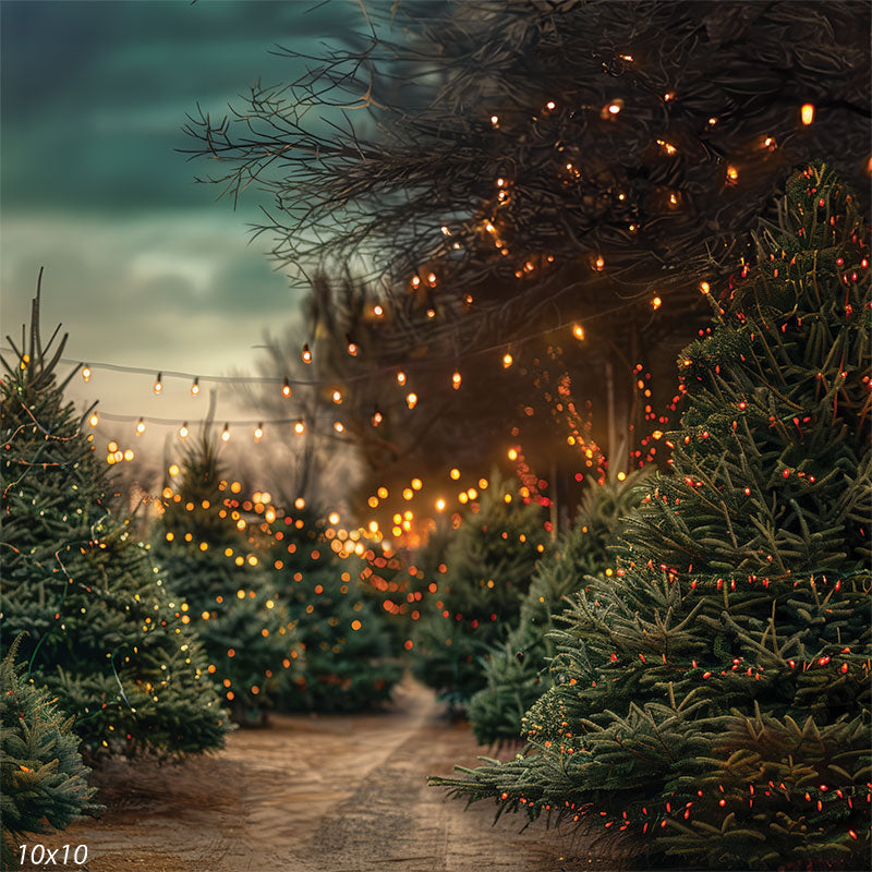 Transform your holiday decor with our Enchanting Outdoor Christmas Tree Pathway Backdrop. This stunning backdrop captures a magical outdoor scene with a pathway lined with beautifully decorated Christmas trees, each adorned with colorful lights. Overhead, strings of fairy lights add to the enchanting ambiance, while the setting sun casts a soft, golden glow. Perfect for holiday-themed photography sessions, festive events, or creating a cozy holiday atmosphere, this backdrop brings the magic of the season to life.