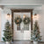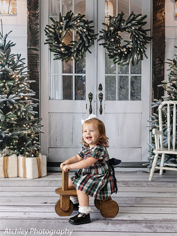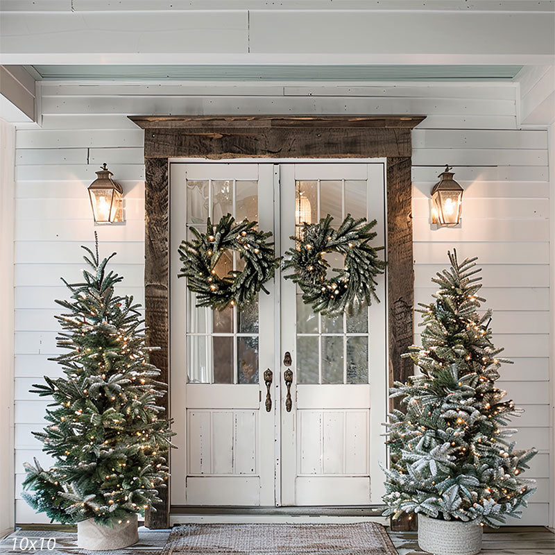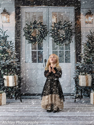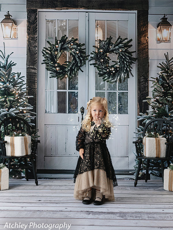 Set the scene for charming winter portraits with the Farmhouse Christmas Porch with Double Doors Printed Photography Backdrop. This festive entryway features vintage white double doors adorned with lit evergreen wreaths, flanked by snow-kissed Christmas trees and rustic wood accents. Perfectly styled to evoke a cozy, farmhouse holiday welcome, this backdrop offers a clean and classic look ideal for both lifestyle and portrait photography.