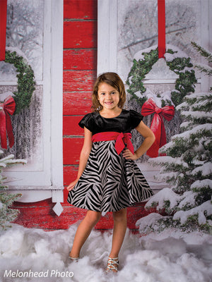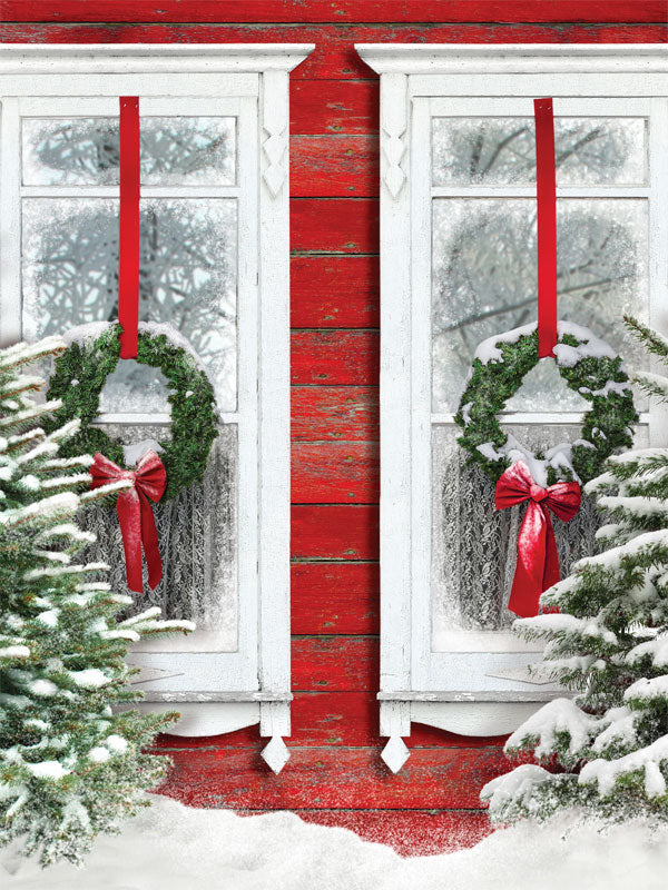 Capture the essence of a cozy winter holiday with the Rustic Red Barn Windows with Snow-Covered Wreaths Photography Backdrop. This beautiful backdrop features a charming red barn wall, complete with two white-framed windows, each adorned with snow-dusted wreaths and bright red bows. Snowy pine trees add a wintry touch to this rustic scene, making it perfect for holiday family portraits, children’s Christmas sessions, and festive product photography. Create warm, nostalgic memories with this inviting holiday backdrop that evokes the charm of a snow-covered countryside barn.
