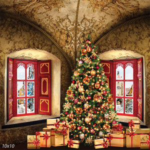 Set in an opulent, vintage room, the backdrop's textured walls and intricate ceiling design add a touch of historical charm, making it ideal for more formal or classic holiday photoshoots. The backdrop also includes a stunning arched window with a vibrant red frame, adding a pop of color and leading the eye to a snowy scene outside. Golden-wrapped presents with bright red bows sit elegantly at the base of the tree, enhancing the luxurious feel of the setup.