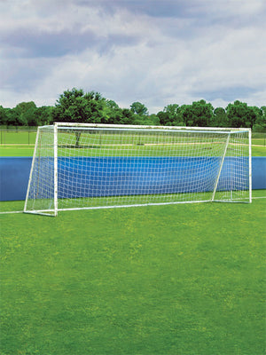 The Gould Field Soccer Photography Backdrop showcases a bright outdoor soccer setting, featuring a regulation goalpost on vibrant green turf with a backdrop of trees and a cloudy sky. Perfect for sports-themed photoshoots, this design delivers authentic game-day energy.