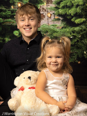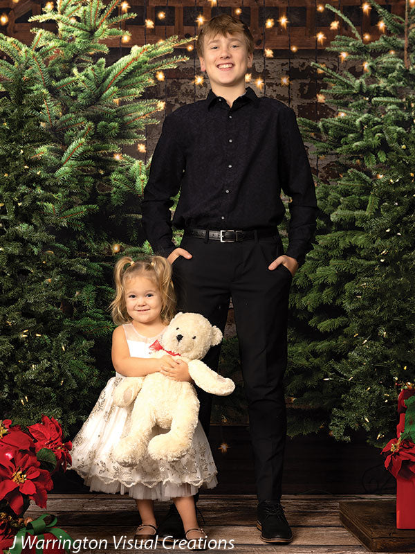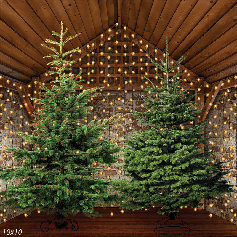 Step into the festive atmosphere of a traditional Christmas tree farm with our Rustic Christmas Tree Farm Photography Backdrop. This beautifully designed backdrop captures the essence of a cozy, rustic setting with two lush evergreen trees framed against a weathered, brick wall adorned with twinkling string lights. The backdrop evokes the nostalgic charm of selecting the perfect tree for the holidays, surrounded by the warm glow of soft lights that bring the scene to life.