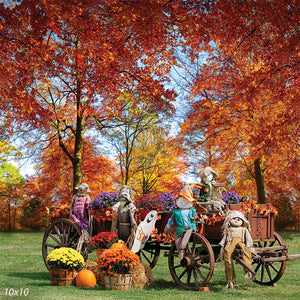 This backdrop is perfect for capturing the essence of fall during family photoshoots, children's portraits, or seasonal promotional photography. It sets a cheerful, welcoming tone that is sure to put a smile on anyone's face. The combination of colorful scarecrows, vibrant foliage, and classic autumn elements makes it a versatile choice for various photography settings.