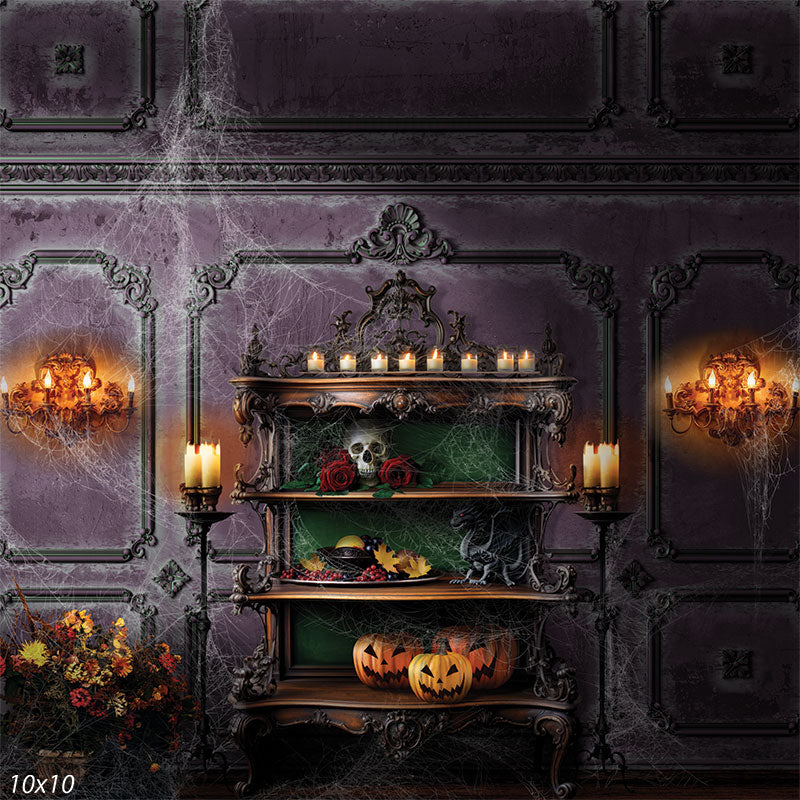 Create a spooky and atmospheric setting for your Halloween-themed photoshoots with the Haunted Halloween Shelf Photography Backdrop. This backdrop features an ornate, gothic-style shelf filled with Halloween decor, including jack-o'-lanterns, skulls, candles, cobwebs, and other eerie elements. Perfect for creating a haunted and mysterious vibe, it adds a dramatic touch to any photoshoot.