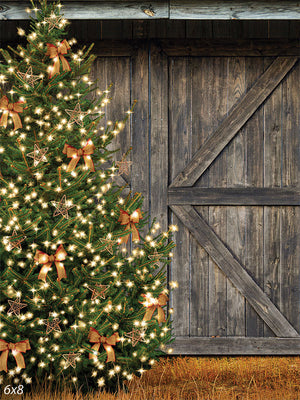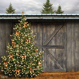 The Rustic Christmas Tree with Lights Photography Backdrop creates the perfect setting for holiday-themed photoshoots. This backdrop features a beautifully decorated Christmas tree with glowing lights, orange bows, and star ornaments, all set against a rustic wooden barn. It offers a warm and festive atmosphere, ideal for capturing the joy of the holiday season.