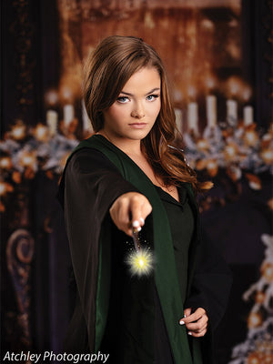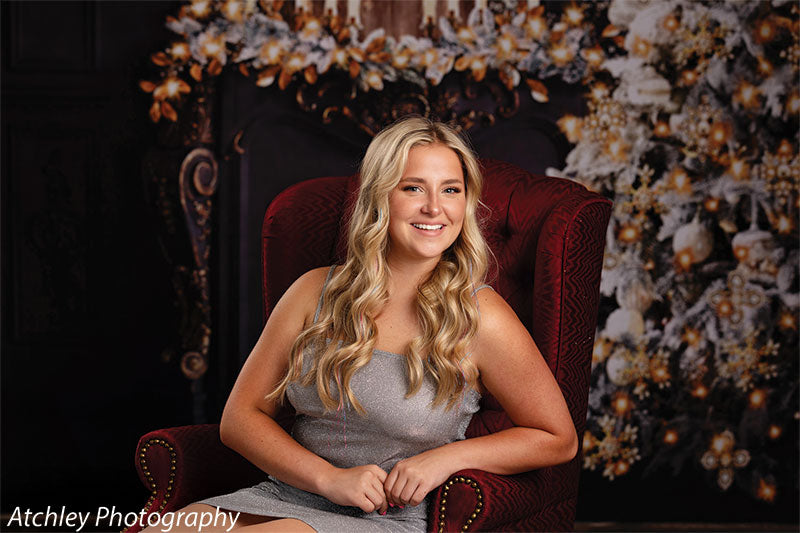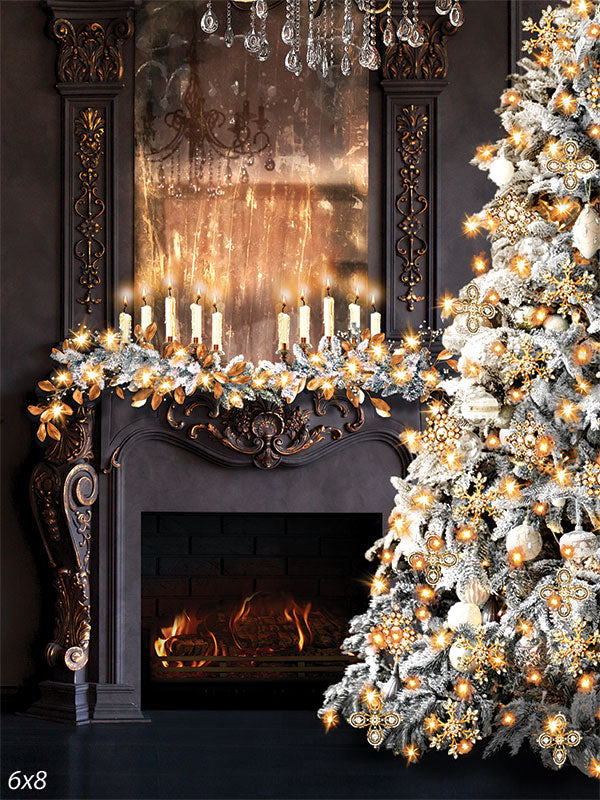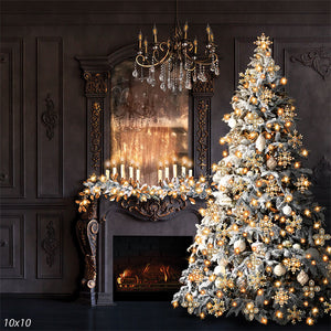 Capture the magic of the holiday season with the Elegant Fireplace & Christmas Tree Photography Backdrop. This backdrop features a grand fireplace, beautifully adorned with candles and garland, next to a shimmering Christmas tree covered in gold and silver ornaments.
