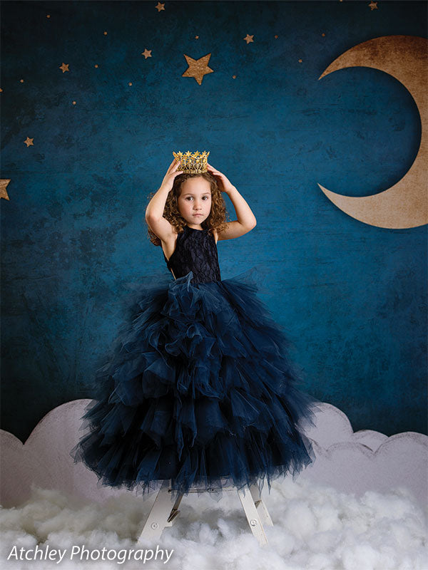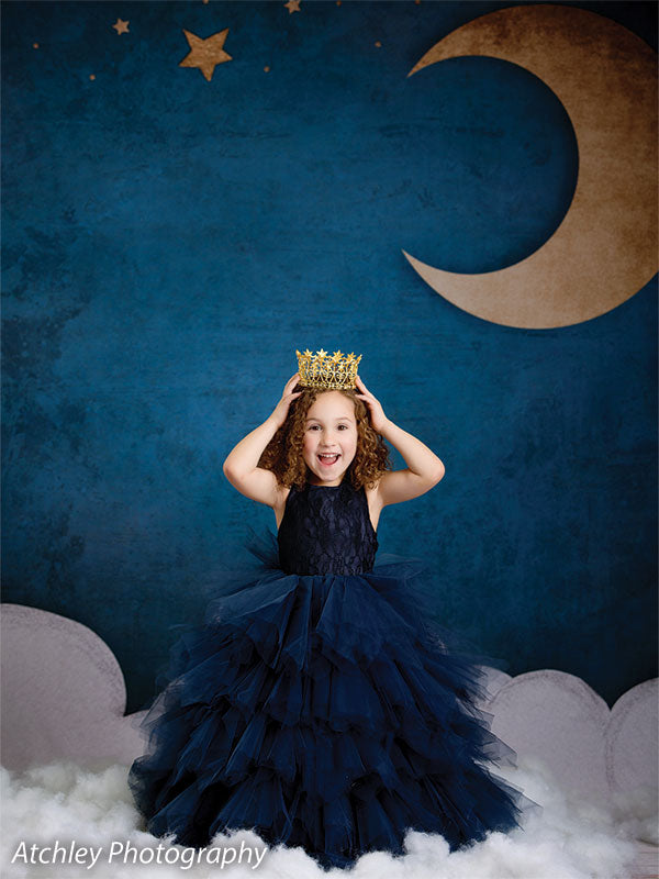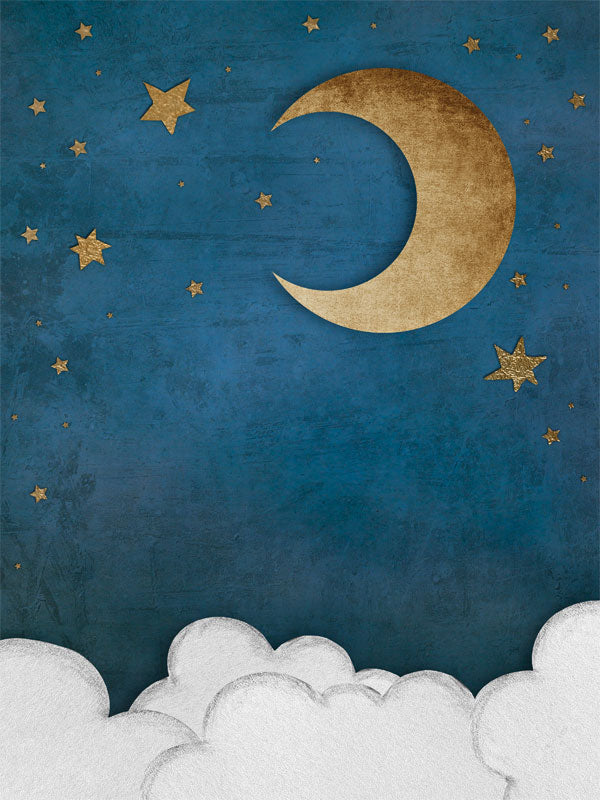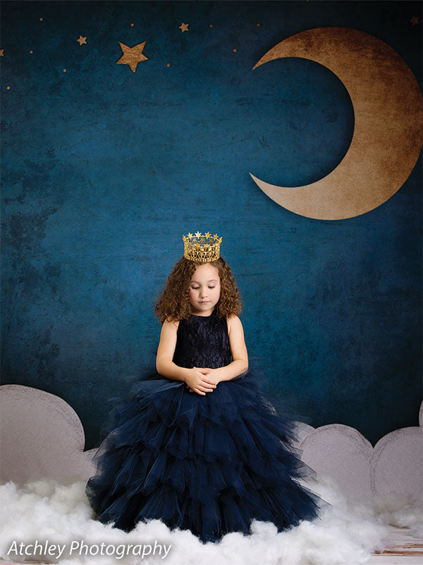 • General Description: A high-resolution, celestial backdrop featuring a golden crescent moon, stars, and soft white clouds set against a rich, deep blue sky, perfect for whimsical and dreamy photoshoots.