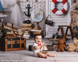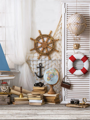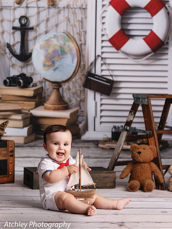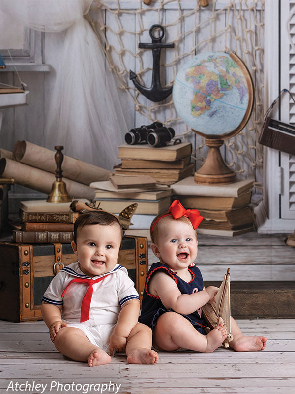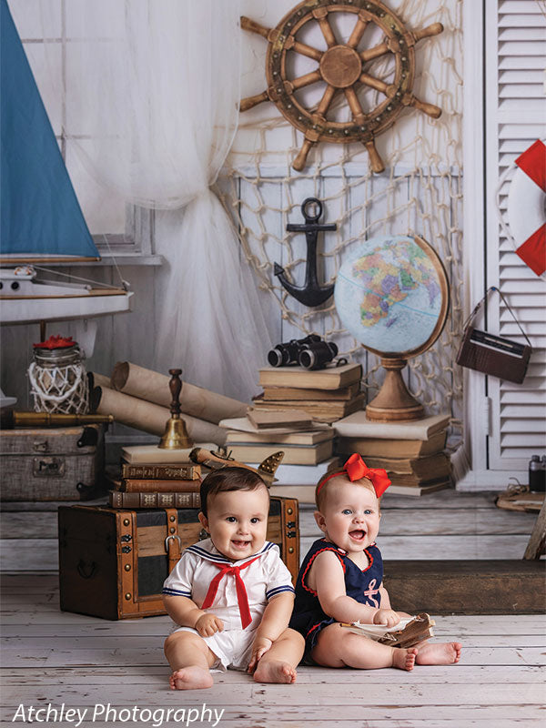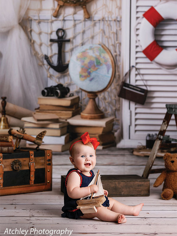 Embark on a creative journey with our Nautical Adventure Photography Backdrop, featuring a beautifully styled setup that evokes the spirit of the sea and the thrill of travel. This backdrop showcases iconic maritime elements such as a ship’s wheel, anchor, life preserver, and vintage globe, all arranged against a crisp and clean background of soft white tones and rustic wood accents. Perfect for creating themed portraits, this backdrop is ideal for photographers specializing in travel, adventure, or nautical-inspired shoots.