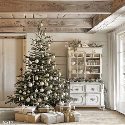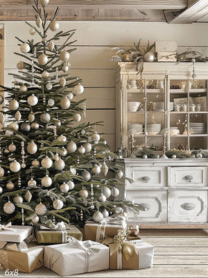 Capture refined holiday elegance with the Neutral Vintage Christmas Tree & Hutch Printed Photography Backdrop. Featuring a beautifully decorated Christmas tree in shimmering champagne and ivory tones, paired with a distressed white hutch filled with curated seasonal décor, this scene exudes timeless sophistication. Its soft neutral palette and rustic textures offer a serene setting perfect for high-end holiday photo sessions.