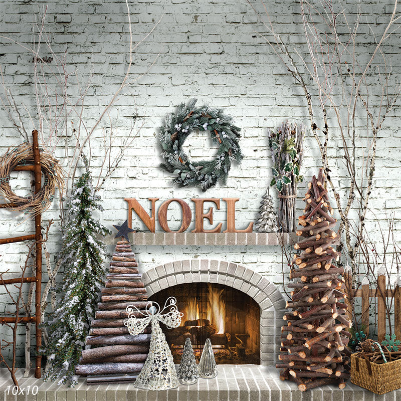 Transform your holiday photoshoots with the Rustic Christmas Fireplace Photography Backdrop. This festive scene features a cozy fireplace adorned with rustic holiday decorations, including a beautifully crafted "NOEL" sign, an evergreen wreath, and a variety of Christmas trees made of natural materials. The warm glow of the fireplace, set against a white brick wall, creates a nostalgic and inviting atmosphere, perfect for capturing the essence of the holiday season.