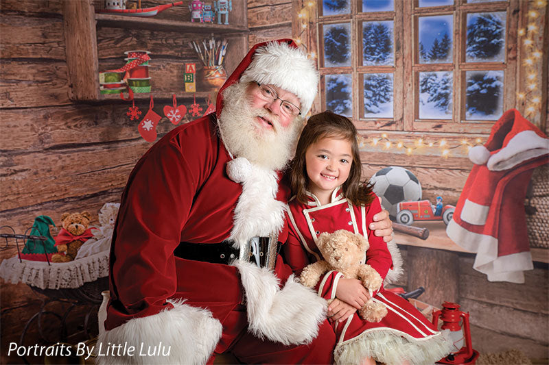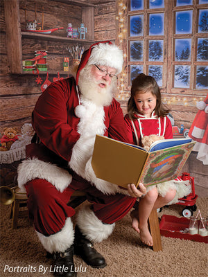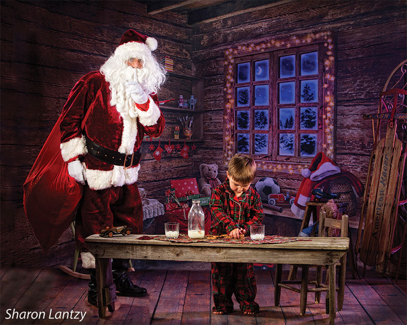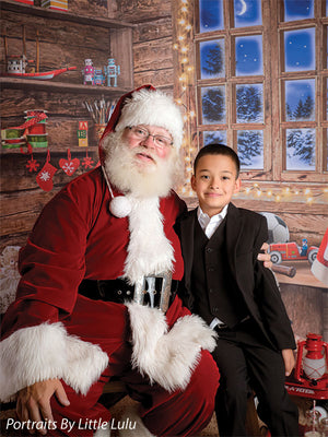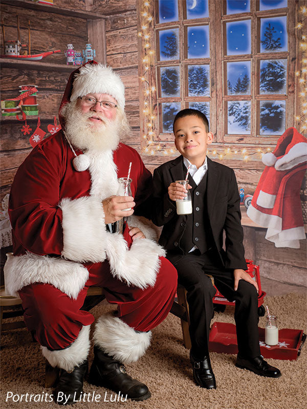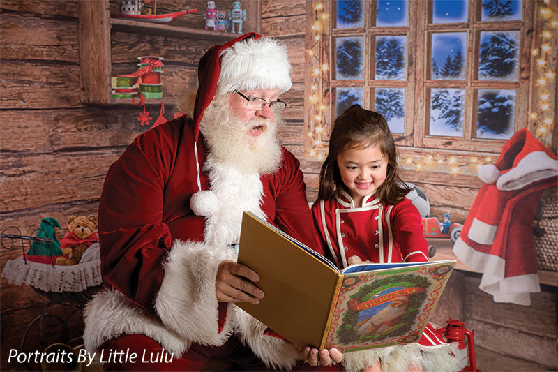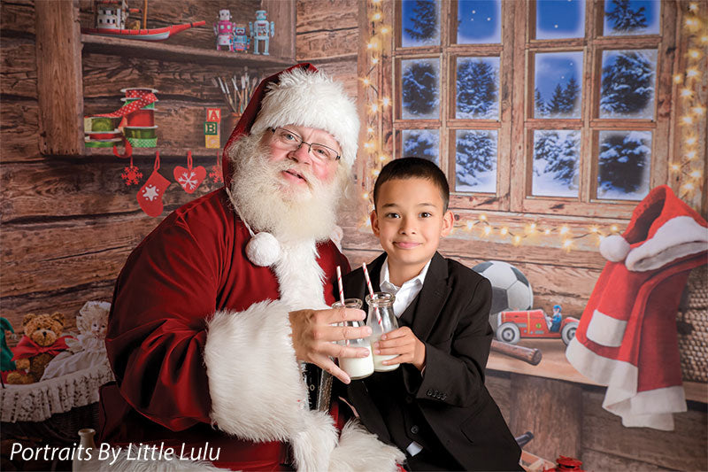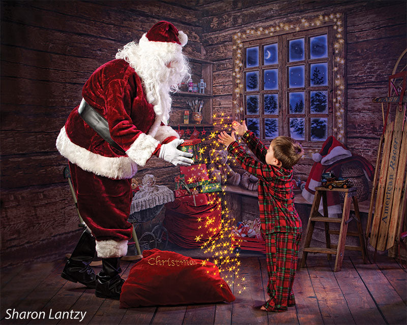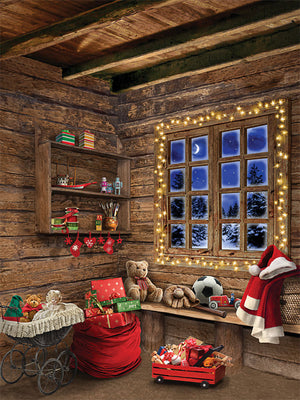 Transport your photography sessions into a cozy Christmas cabin setting with this charming backdrop. The image features a beautifully rustic, wooden interior decorated for the holiday season. A glowing window frames a stunning view of a snowy, moonlit night, while shelves filled with festive decor, presents, and toys add warmth and joy to the scene. Complete with twinkling lights and holiday accessories such as stockings, a Santa hat, and a red wagon filled with gifts, this backdrop creates the perfect holiday ambiance for family portraits, holiday cards, and seasonal product photography.
