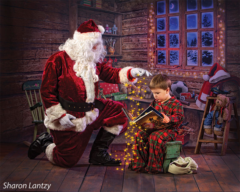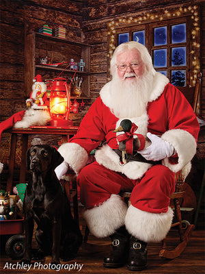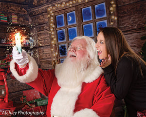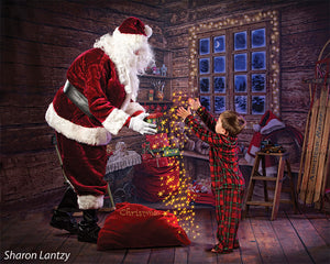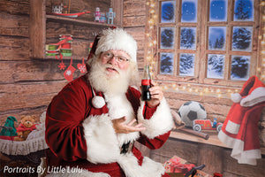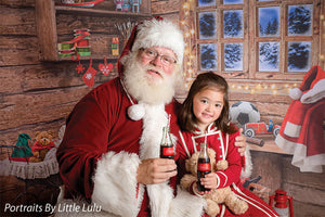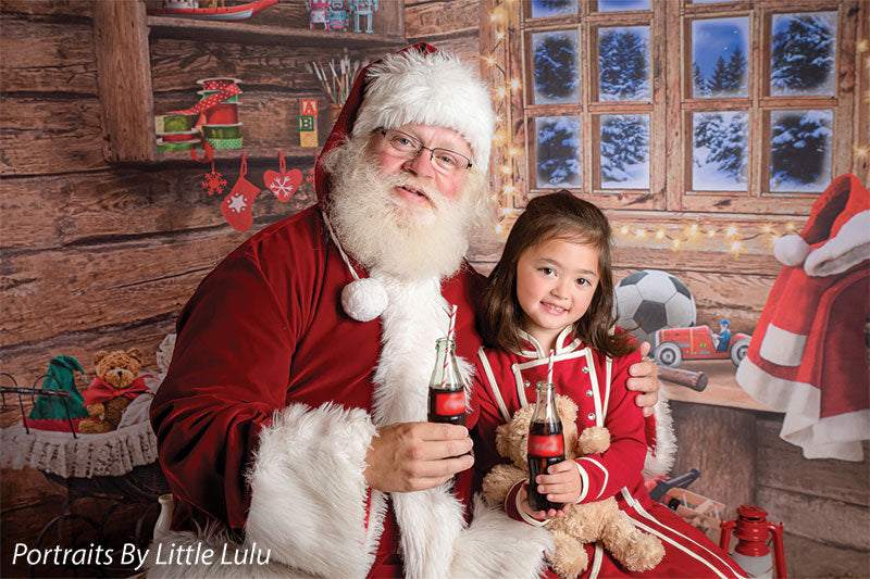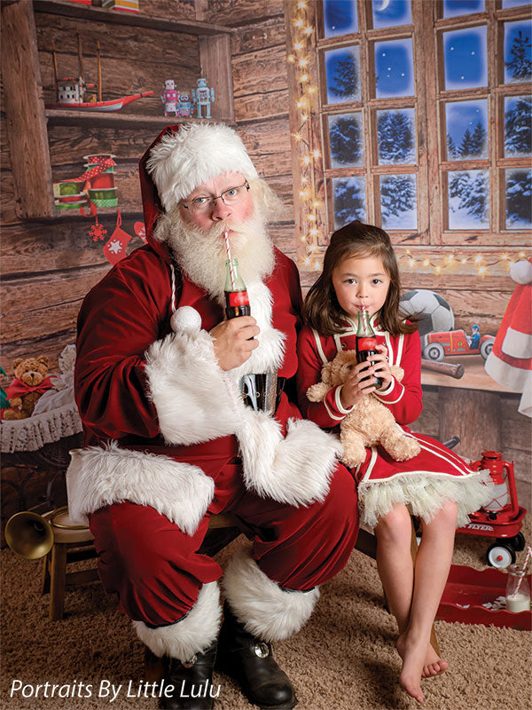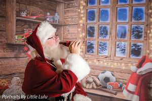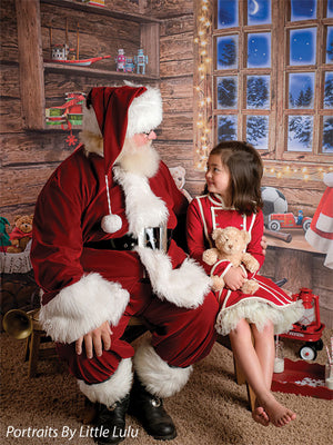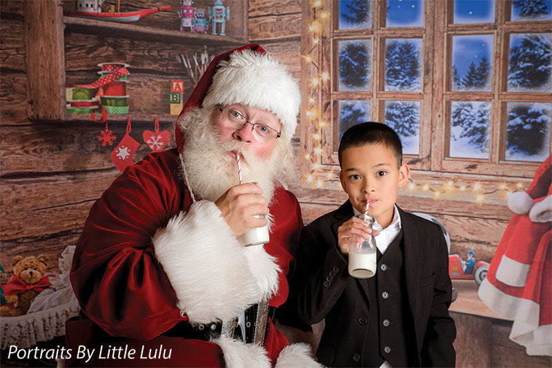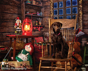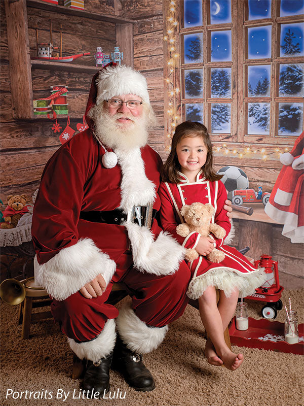 Transport your photography sessions into a cozy Christmas cabin setting with this charming backdrop. The image features a beautifully rustic, wooden interior decorated for the holiday season. A glowing window frames a stunning view of a snowy, moonlit night, while shelves filled with festive decor, presents, and toys add warmth and joy to the scene. Complete with twinkling lights and holiday accessories such as stockings, a Santa hat, and a red wagon filled with gifts, this backdrop creates the perfect holiday ambiance for family portraits, holiday cards, and seasonal product photography.