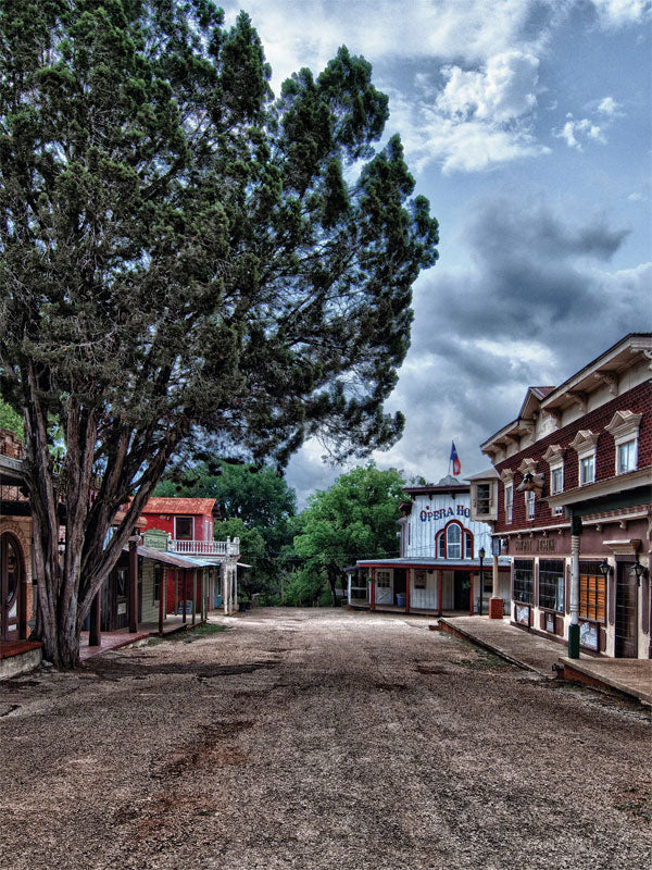 Step back into the Old West with this detailed and atmospheric Western Town Photography Backdrop. Featuring a quiet, rustic street lined with vintage-style buildings, including a charming opera house and a large tree dominating the foreground, this backdrop offers a rich and textured setting perfect for professional photography. Whether you're capturing western-themed portraits, family photos, product shoots, or editorial content, this backdrop delivers a visually immersive experience.