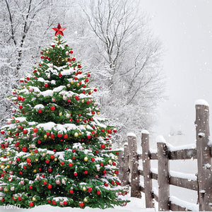 Capture the magic of the holiday season with our Winter Wonderland Christmas Tree Photography Backdrop. This beautiful scene features a lush, green Christmas tree adorned with colorful ornaments and blanketed in fresh, glistening snow. The tree is set against a serene winter background, with snow-covered trees and a rustic wooden fence that adds a touch of countryside charm. The backdrop is perfect for creating a festive and cozy atmosphere in your holiday photoshoots.