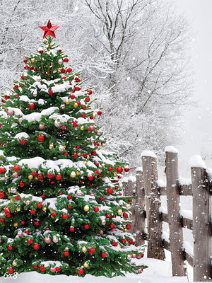 The Winter Wonderland Christmas Tree Photography Backdrop is a captivating scene that brings the essence of a tranquil, snowy Christmas to your photoshoots. The centerpiece of this backdrop is a vibrant, green Christmas tree adorned with a variety of colorful ornaments. The tree is topped with a striking red star, adding a classic holiday touch. Snow delicately dusts the branches and ornaments, enhancing the festive feel and making it ideal for capturing the warmth and joy of the season.