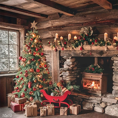 Bring cozy, country-style charm to your holiday sessions with the Painted Rustic Christmas Fireplace & Tree Printed Photography Backdrop. This digitally painted scene captures a classic log cabin interior with a stone fireplace glowing with warmth, a richly decorated Christmas tree, and a vintage red sleigh surrounded by rustic wrapped gifts. Designed to look like a soft painted illustration, this backdrop adds timeless, homestyle character to every photo.