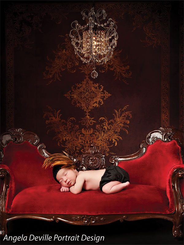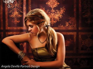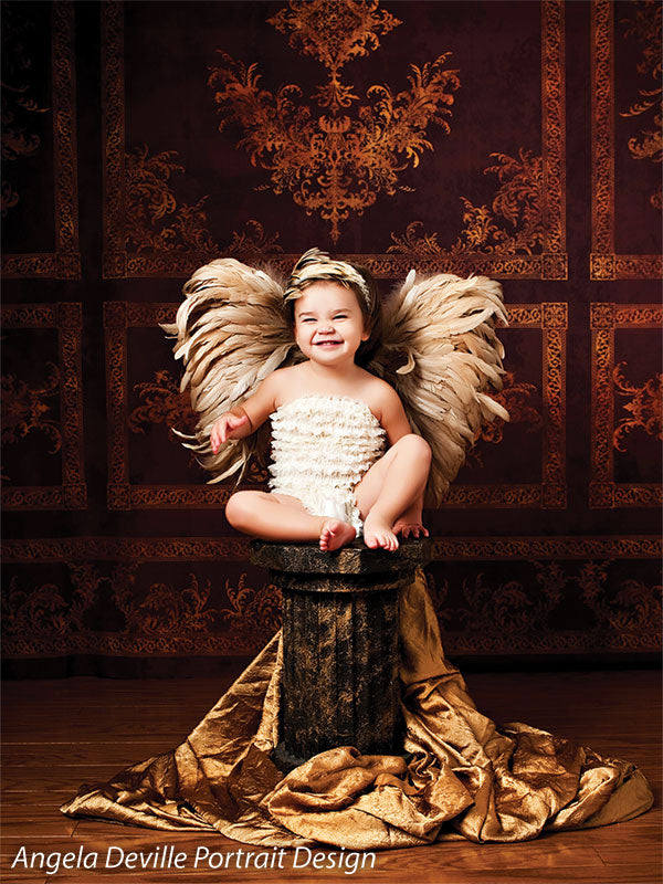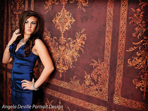 Introduce luxurious grandeur to your studio with the Regal Burgundy Gold Damask Photography Backdrop. Featuring deep burgundy tones adorned with intricate gold damask patterns and ornate framing, this backdrop offers a rich, elegant setting ideal for portraiture, fine art photography, and styled editorial shoots.