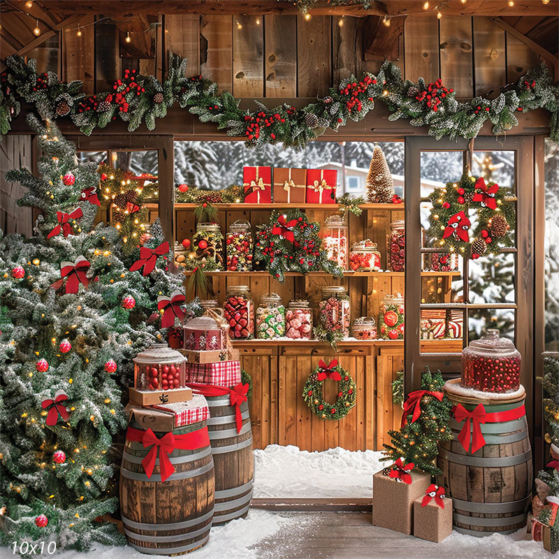 Bring festive cheer and nostalgic warmth to your holiday photo sessions with the Rustic Christmas Candy Shoppe Printed Photography Backdrop. This charming backdrop features a cozy wooden booth brimming with jars of colorful Christmas candies, bright red bows, wreaths, wrapped gifts, and snow-covered pine garlands. Ideal for creating a welcoming and joyful seasonal setting, it evokes the timeless magic of a small-town winter market.