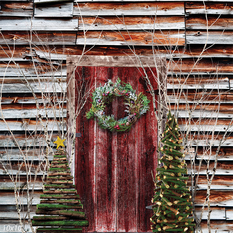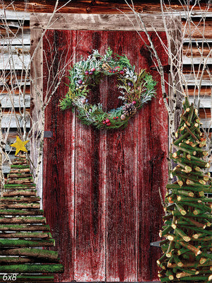 Step into a festive countryside scene with our Rustic Christmas Barn Door Photography Backdrop. This charming backdrop features a beautifully weathered red barn door, adorned with a lush Christmas wreath made of evergreen branches, pinecones, and berries, exuding the warmth and joy of the holiday season. Flanking the door are two rustic, handcrafted Christmas trees made from logs and branches, adding a touch of natural elegance to the scene. The background elements, including the barn's wooden textures and the surrounding twigs, create a cozy and nostalgic atmosphere, perfect for capturing the essence of a rustic Christmas celebration.