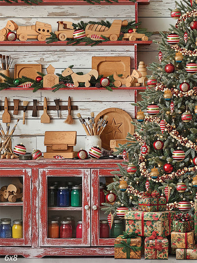 Bring nostalgic charm to your holiday photo sessions with this richly detailed Santa’s Workshop backdrop. Featuring handcrafted wooden toys, vintage red shelving, a decorated Christmas tree, and wrapped presents, this backdrop sets the perfect scene for cozy, heartwarming portraits. The layered set design offers depth and festive color, ideal for seasonal studio setups that evoke the magic of Christmas morning.