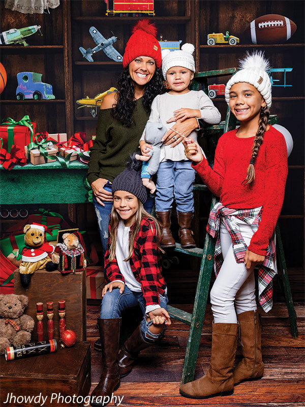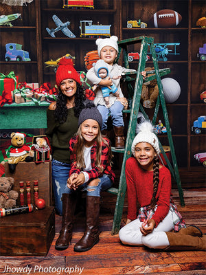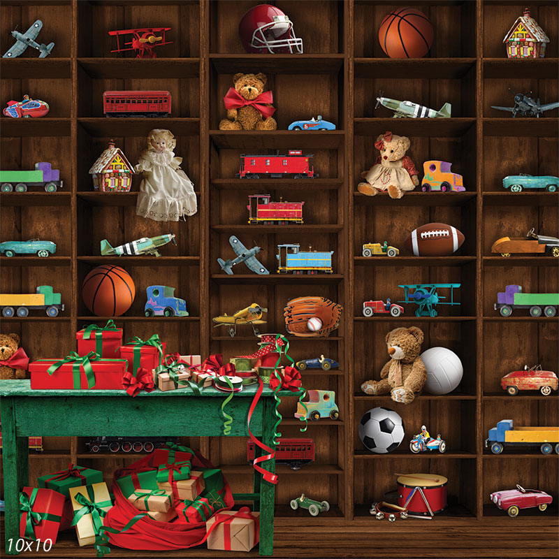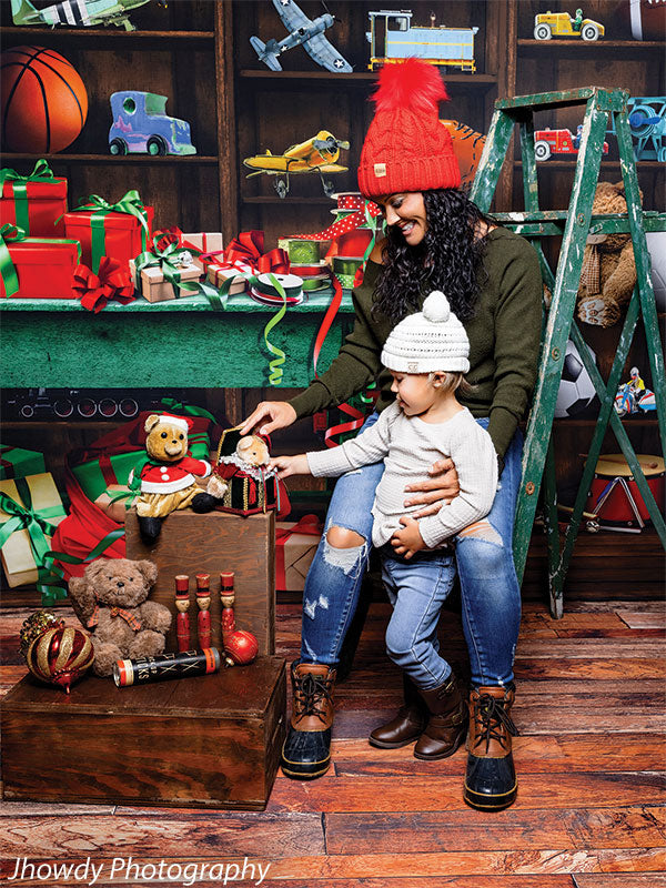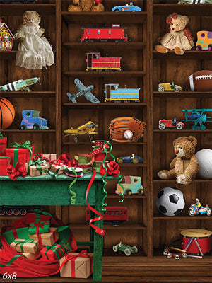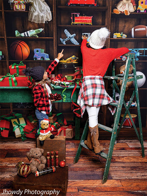 Step into the whimsical world of childhood with our Vintage Toy Shop Photography Backdrop. This delightful backdrop transports you to a charming toy shop, brimming with nostalgia and warmth. The backdrop features shelves lined with an assortment of classic toys, including teddy bears, wooden trains, model airplanes, and sports balls, all meticulously arranged to evoke the magic of a bygone era. The centerpiece of the scene is a festive green table adorned with beautifully wrapped gifts, ready to ignite the excitement and joy of the holiday season.