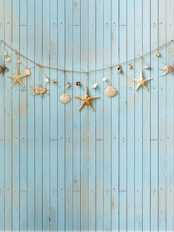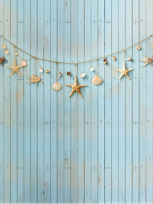 • General Description: A weathered, beach-inspired backdrop featuring light blue wood panels and a hanging garland of starfish and seashells.