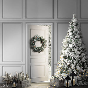 Step into a serene winter wonderland with this exquisite photography backdrop. Featuring an elegant white door adorned with a frosted green wreath, this scene opens up to a breathtaking winter landscape. The backdrop includes a beautifully decorated Christmas tree, covered in snow-dusted branches and sparkling lights, surrounded by baskets filled with silver and gold ornaments. The minimalist and sophisticated design is perfect for creating a cozy and festive atmosphere, ideal for holiday portraits and seasonal photoshoots.