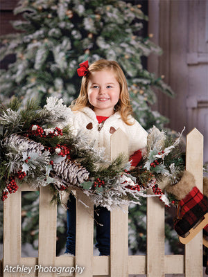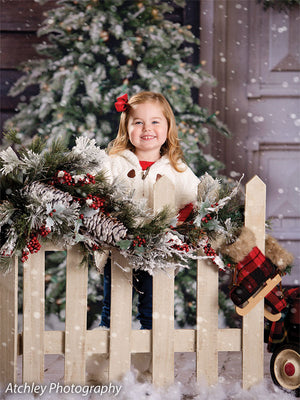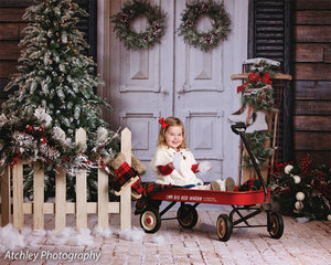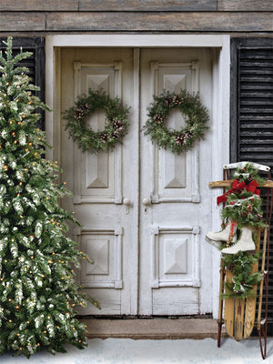 Celebrate the magic of the holiday season with this vintage Christmas door photography backdrop. Perfect for creating a cozy, nostalgic atmosphere, this backdrop features double white doors adorned with classic green wreaths, surrounded by traditional holiday decor. To the left stands a snow-covered Christmas tree, while a charming sled and ice skates sit to the right, completing the festive scene. Ideal for holiday family portraits, Christmas card photos, and seasonal product shoots, this backdrop brings warmth, charm, and a sense of timeless holiday tradition to your photoshoots.