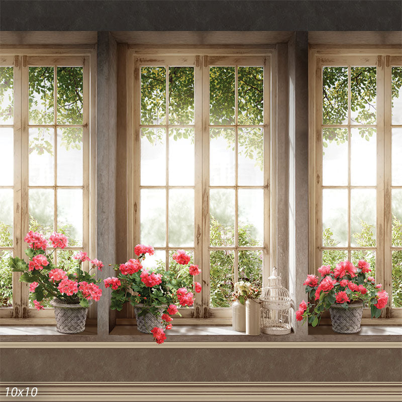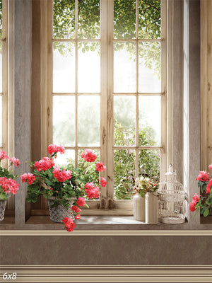 The Rustic Floral Window Photography Backdrop offers a beautifully serene and charming setting for any photographer looking to create a warm and cozy atmosphere in their photos. This backdrop features an idyllic view through a rustic window adorned with vibrant pink flowers, basking in soft natural light. Outside the window, leafy greenery provides a peaceful and fresh ambiance, while the birdcage and ceramic vases on the windowsill enhance the setting with a quaint and vintage feel.