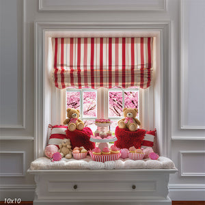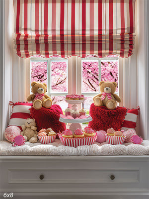 Create heartwarming and festive photographs with the Valentine's Day Teddy Bear Tea Party Backdrop. This charming design showcases a cozy window seat adorned with vibrant red and white striped cushions, plush teddy bears, and delightful cupcakes. The backdrop radiates the warmth and sweetness of Valentine's Day, making it an ideal choice for children's portraits, holiday events, and studio photography.