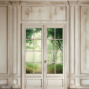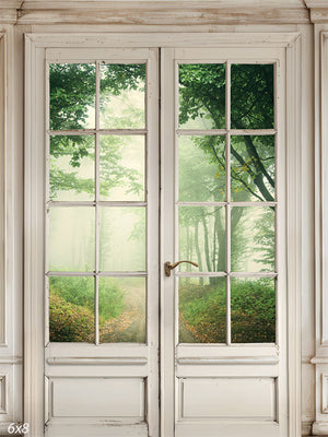The Vintage Door with Forest View Photography Backdrop captures the serene beauty of nature through an elegant vintage door. This backdrop features a beautifully aged door with intricate paneling, opening up to a tranquil forest scene with lush greenery and a misty pathway. Perfect for creating a serene and timeless setting, this backdrop is ideal for various photography sessions including portraits, family photos, and editorial shoots.