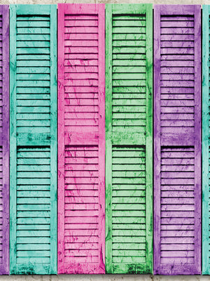 The Vogue Shutters Photography Backdrop showcases a vibrant arrangement of weathered shutter panels in mint, pink, green, and lavender hues. With its retro-chic palette and rustic textures, this backdrop blends playful color with vintage charm, making it a standout choice for creative photo sessions. Each shutter is uniquely distressed to add character and authenticity, perfect for bold and expressive portraiture.