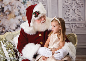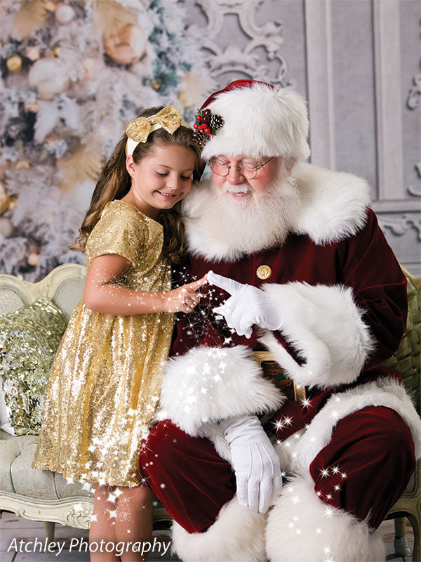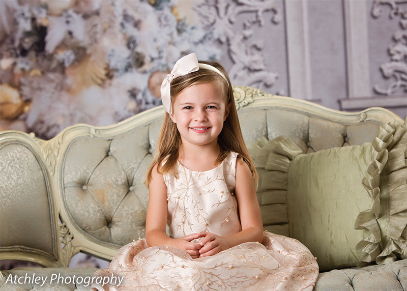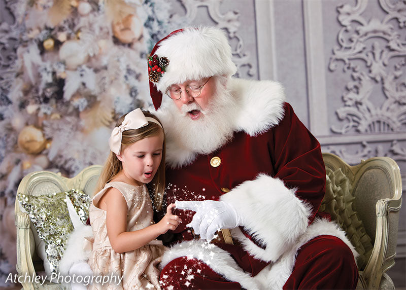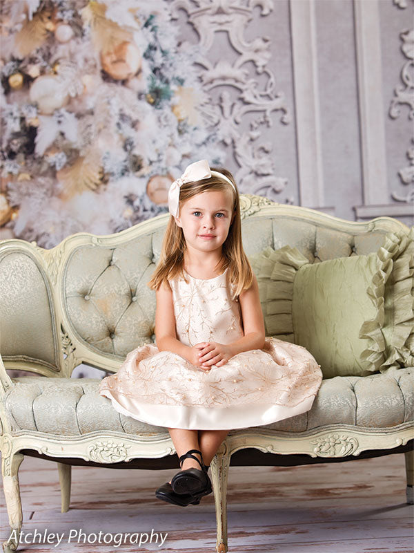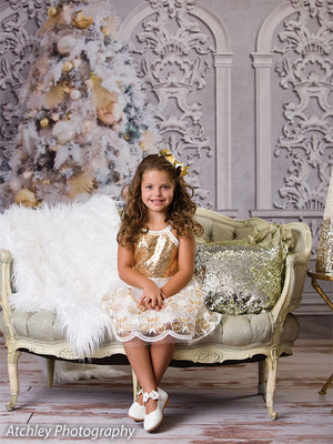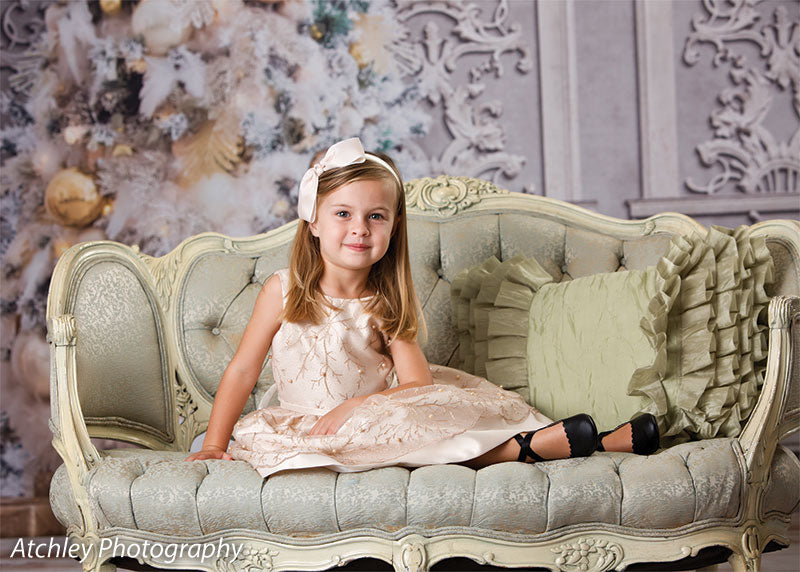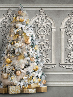 The Luxurious Christmas Tree Photography Backdrop provides an elegant and festive scene, perfect for capturing warm holiday memories. Featuring a beautifully decorated Christmas tree adorned with gold ornaments and white feathers, this backdrop brings a touch of luxury to any holiday-themed photoshoot. The intricate, ornate background enhances the festive ambiance, creating a setting that is both regal and cheerful.