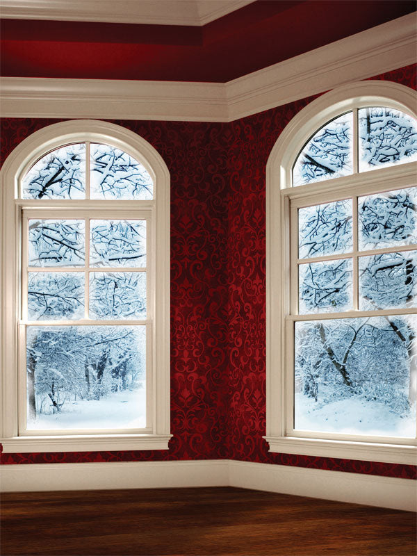 Create the perfect winter setting for your photoshoots with the Elegant Winter Window Photography Backdrop. This backdrop features a charming interior scene with rich, red damask-patterned walls, framed by two large, elegantly arched windows. The windows open up to reveal a picturesque, snow-covered landscape of bare trees and frosty branches, bringing a peaceful and wintry atmosphere to your photography sessions.