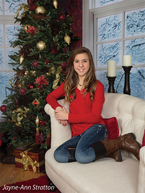With its bold red tones, white window trim, and snowy outdoor landscape, this backdrop is ideal for creating warm and cozy indoor winter scenes. The high contrast between the warm interior and the frosty winter outside offers photographers the chance to play with light, warmth, and seasonal storytelling in their photoshoots. Whether you’re capturing family portraits, holiday product photography, or winter-themed fashion shoots, this backdrop provides the perfect balance of warmth and winter wonderland.