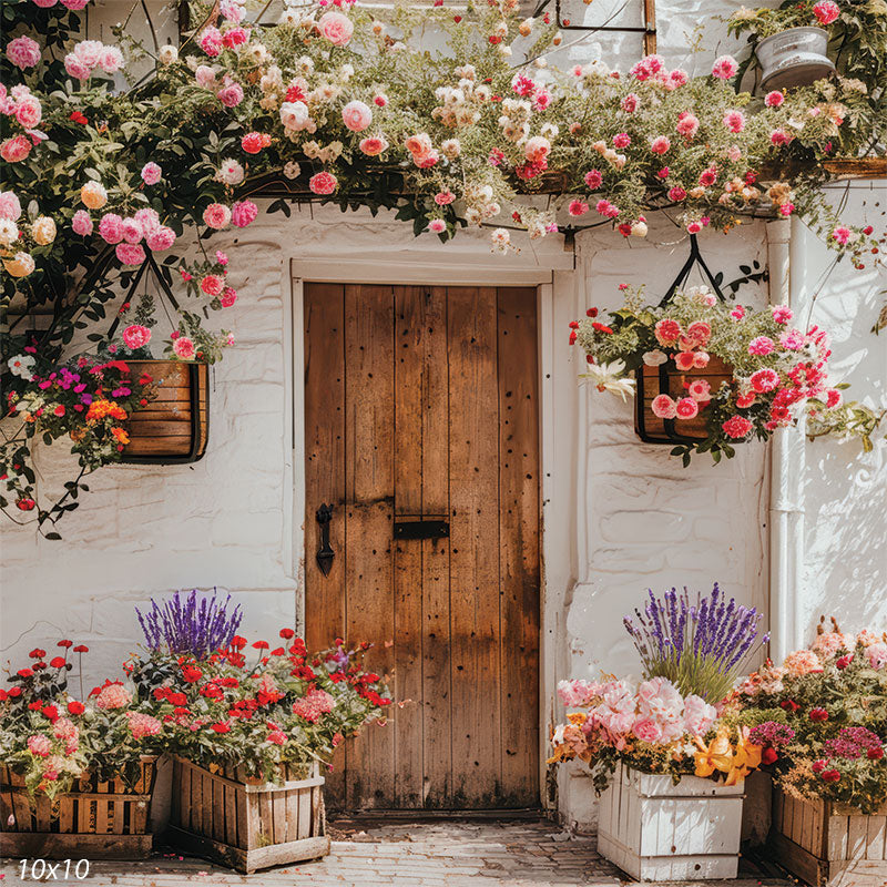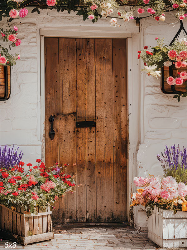 The Wooden Door with Spring Flowers Easter Backdrop offers a beautifully rustic scene perfect for professional photography sessions. Featuring a natural wooden door set against a textured white wall, this backdrop is framed with colorful spring flowers, including vibrant reds, purples, and soft pink blooms. The rich wood tones and fresh florals provide a warm and inviting atmosphere, making it an ideal choice for spring backdrops, Easter portraits, and seasonal photography sessions.